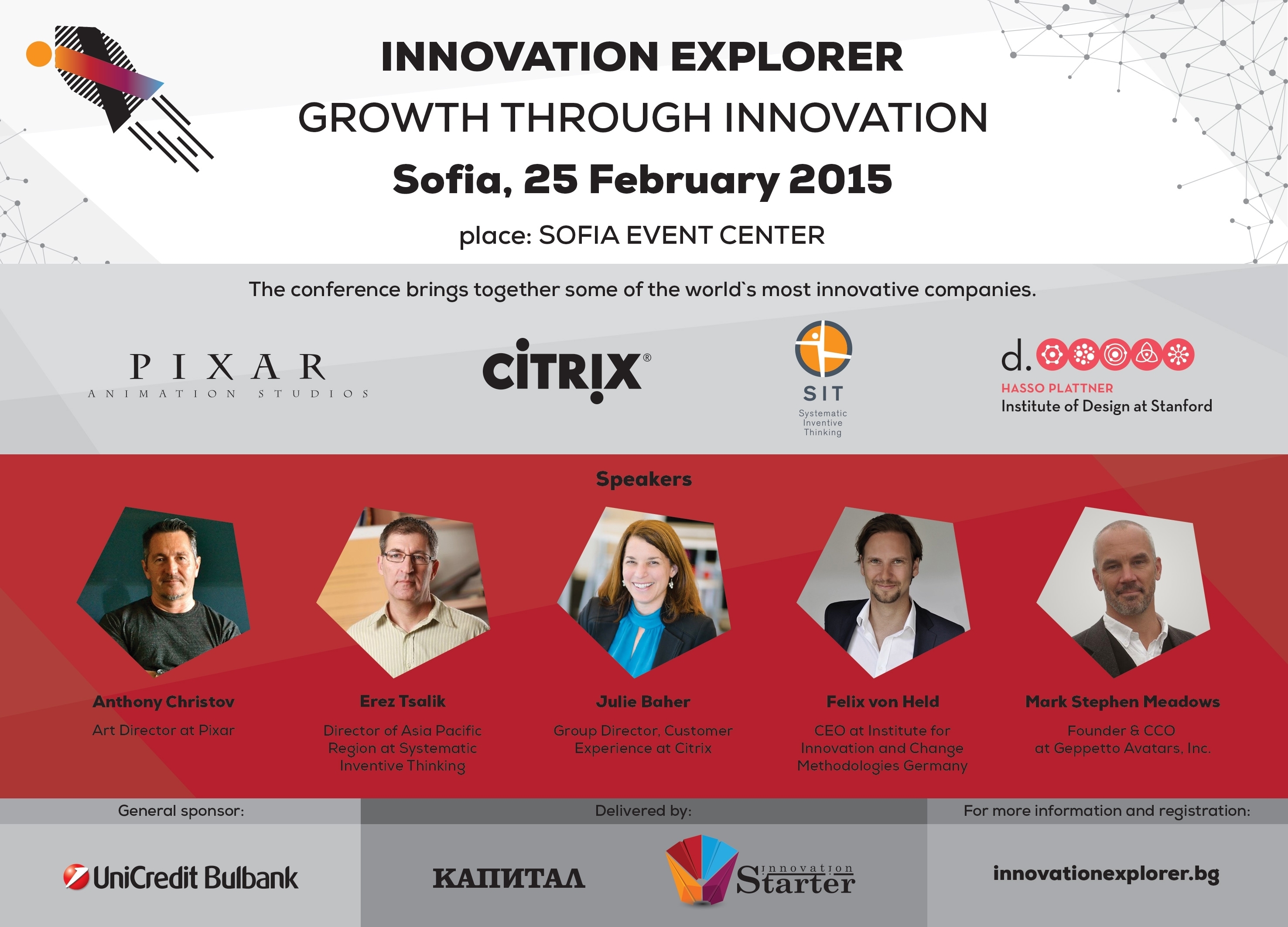 Конференцията, която ще се проведе на 25.02.2015 г., в Sofia Event Center, събира за пръв път в България, топ 20 от водещите глобални иноватори, като Pixar, Citrix, SIT, d.school Stanford, Geppetto Avatars, IICM и др., които ще представят тенденциите в ключовите категории на иновациите: Креативност, Disruptive Innovation, Open Innovation, Развитие на нови продукти, Социални иновации.