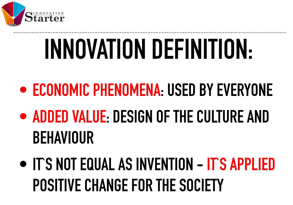 Дефиниция за иновация, с която ние работим звучи така: „Иновацията e икономически феномен (това означава масово решение, което носи приход или ползи за обществото в голям мащаб); Иновацията е въведено в употреба креативно решение (приложно изобретение, отново в икономически смисъл); иновацията е гарантирана позитивна промяна за обществото“.