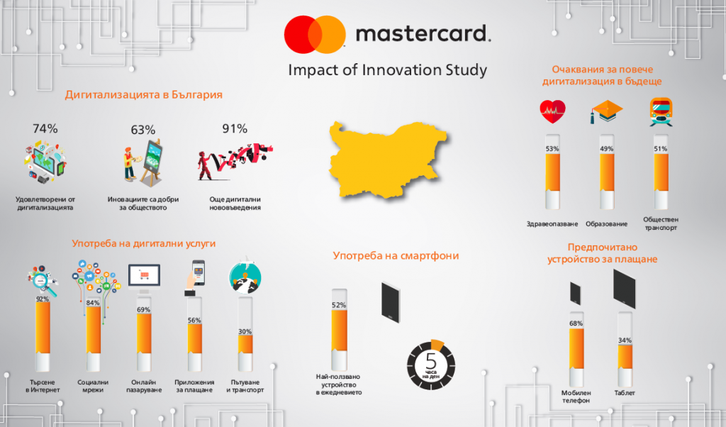 Проучването Mastercard Impact of Innovation  изследва отношението към  дигитализацията и нейното въздействие върху обществото, личните предпочитания при използването на дигиталните технологии за плащане, както и за автентификация при плащане. Проучването също така показа колко склонни са респондентите да възприемат и активно да използват дигиталните технологии.